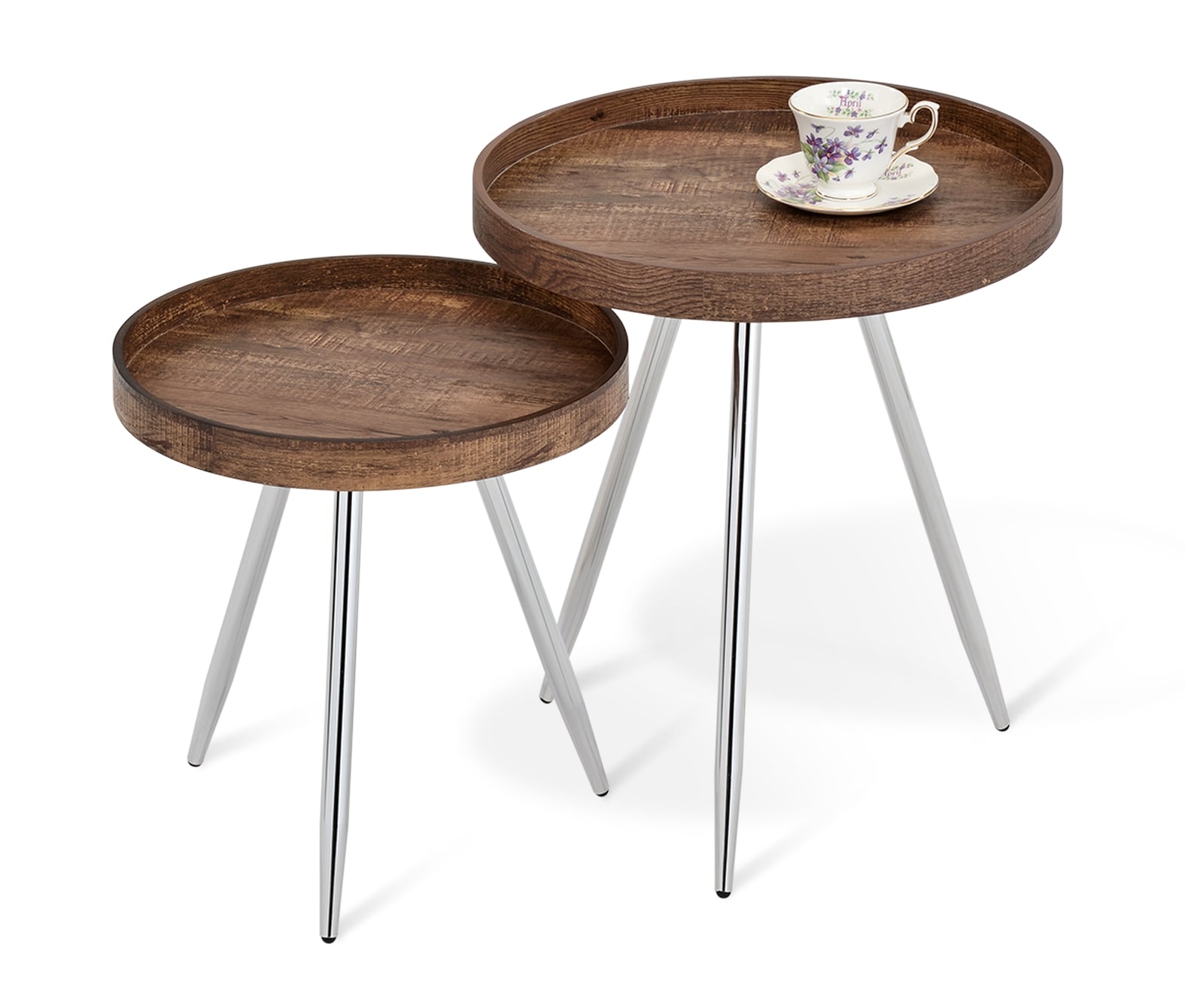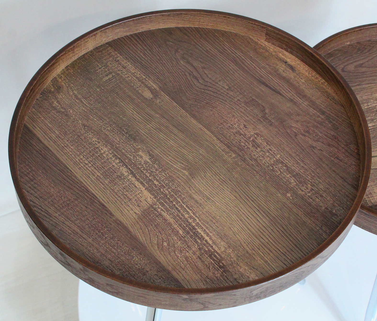 Вы можете использовать два столика в комплекте, красиво перекрыв один другим. Или в качестве отдельных столиков в каждой комнате своего дома. За ненадобностью можно полностью один задвинуть за другой. Диаметр большего столика 458 мм, высота 500 мм. Диаметр меньшего столика 400 мм, высота 420 мм.