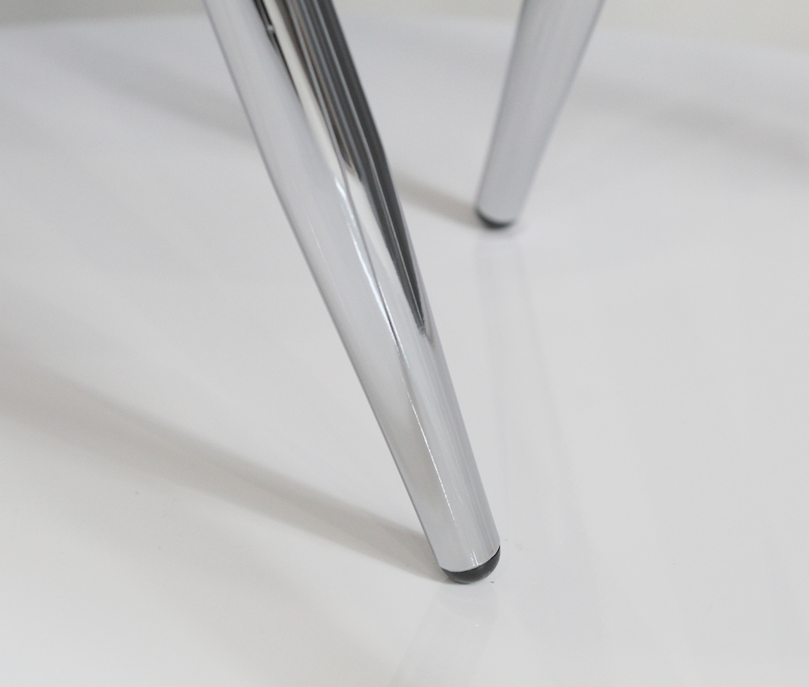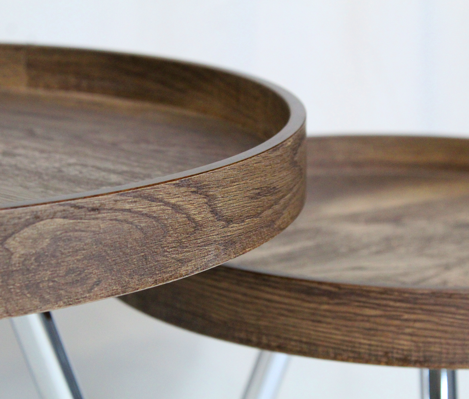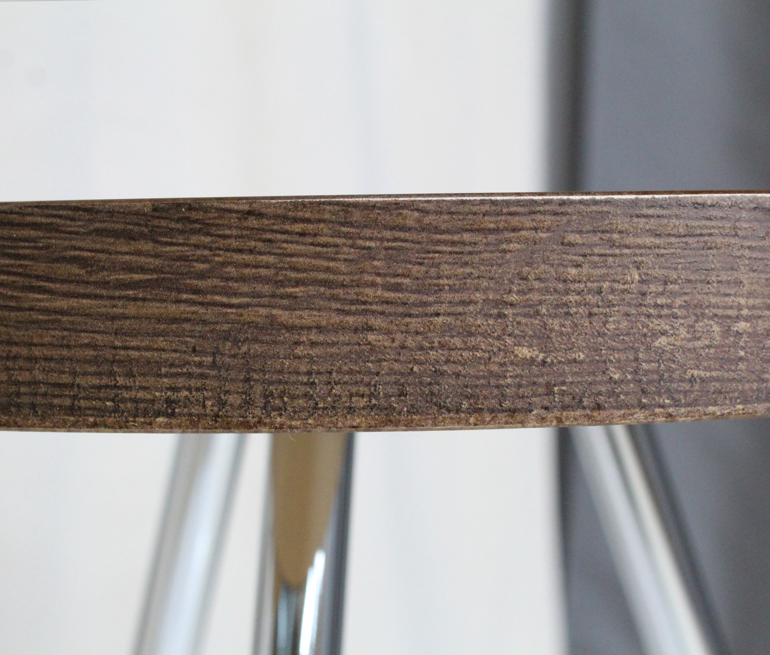 Столешницы из гнутой фанеры МДФ смотрятся тонкими и невесомыми, поскольку имеют скошенный переход от лицевой поверхности к обратной. Рисунок под натуральное дерево добавит естественности и натуральности в интерьер. Бортик по краю столешниц позволяет бокалам и тарелкам не упасть во время использования. Толщина бортика 8 мм, высота бортика внутри 30 мм, а снаружи 40 мм. Хромированные ножки сделают красивый акцент в помещении.