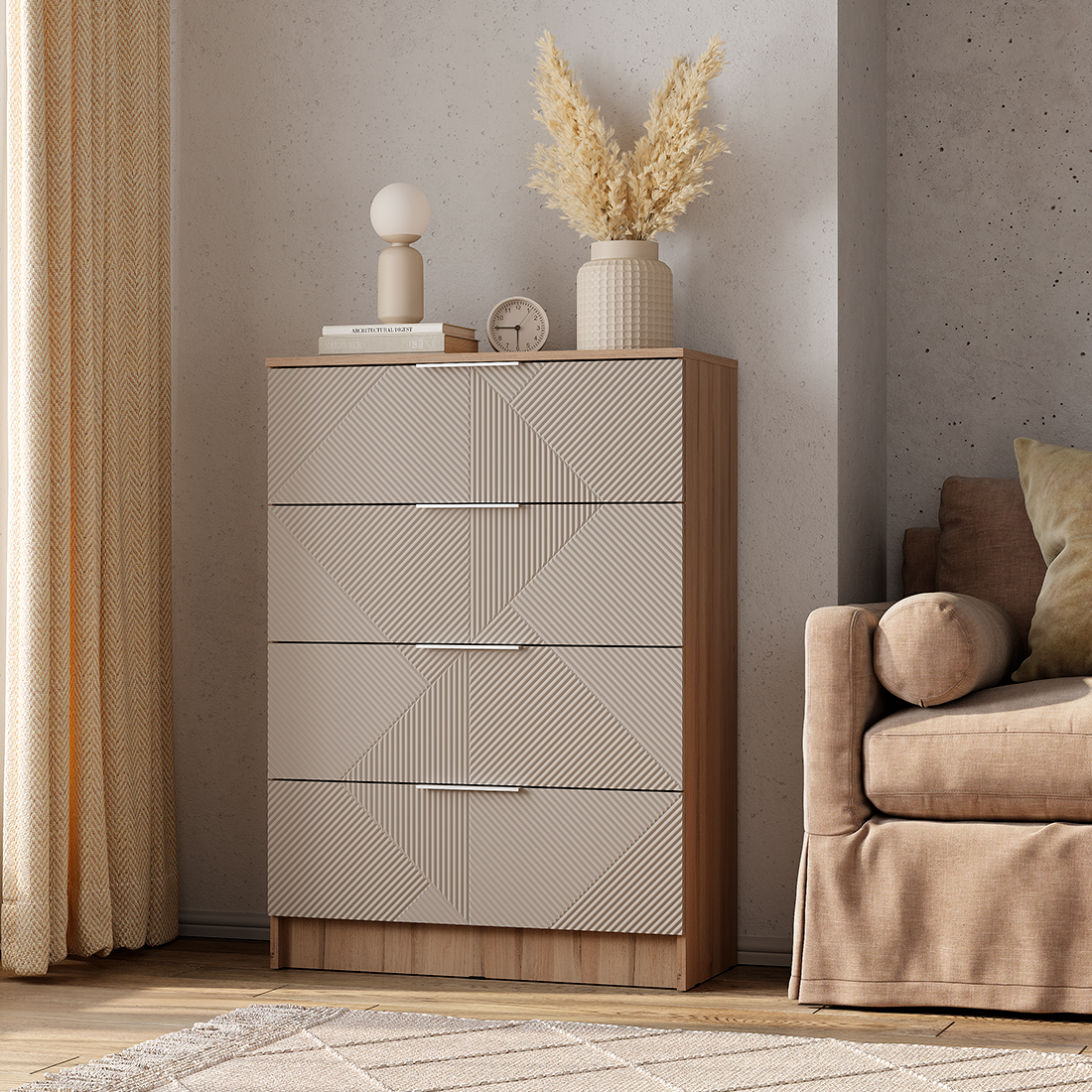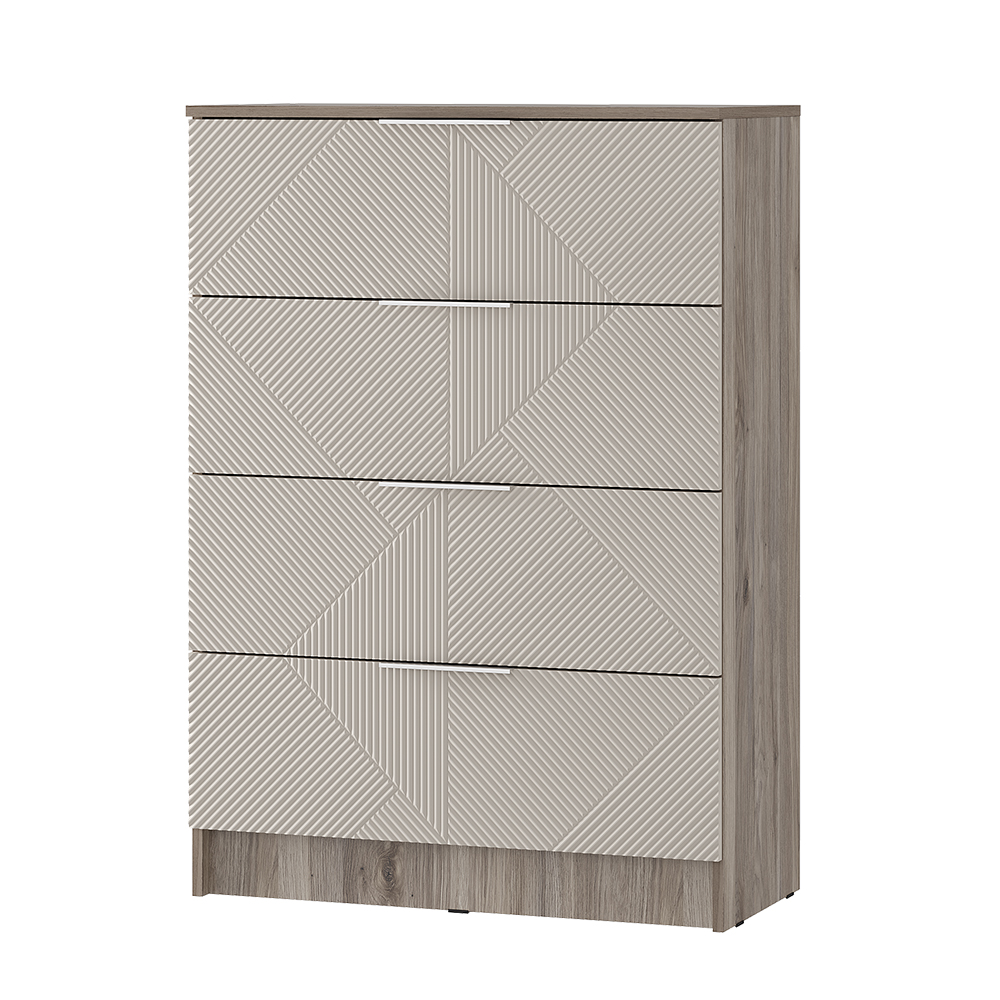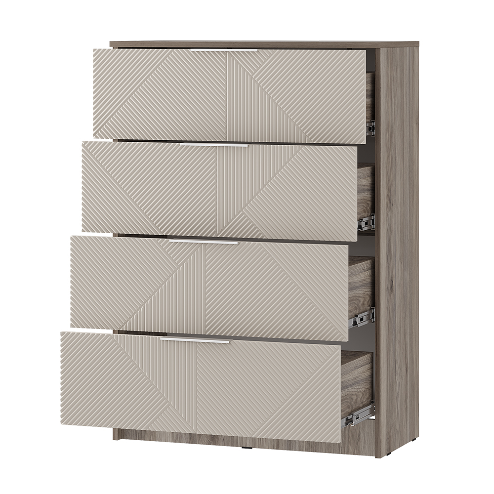 Комод «Эмилия» КМ-02 — это идеальное сочетание минималистичного дизайна и продуманной функциональности. Модель с четырьмя просторными ящиками станет стильным решением для хранения одежды, белья и аксессуаров в спальне, гостиной или детской. Нежная цветовая гамма «дуб смоки» и «айриш» в сочетании со стильной фрезеровкой фасадов наполняет интерьер светом и легкостью. Эргономичные фасады обеспечивают удобное и легкое открывание ящиков без лишних усилий.