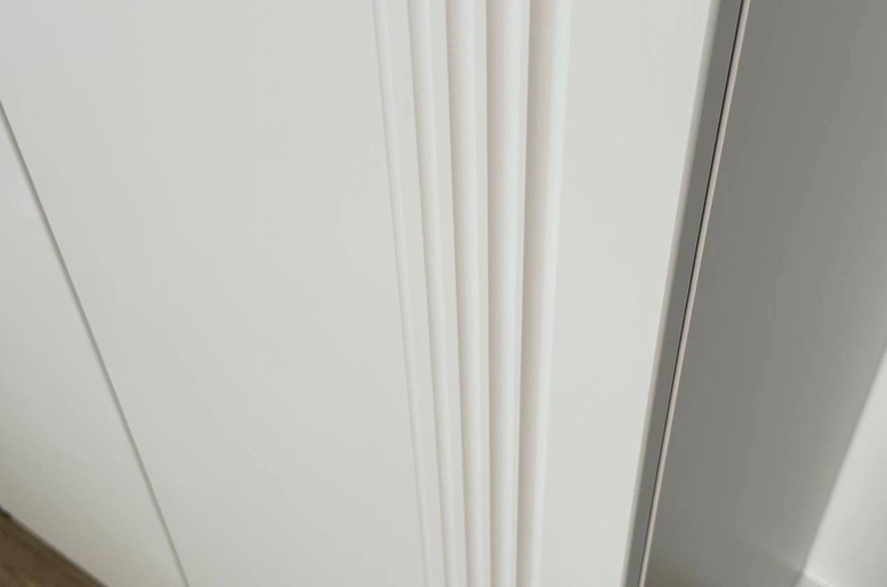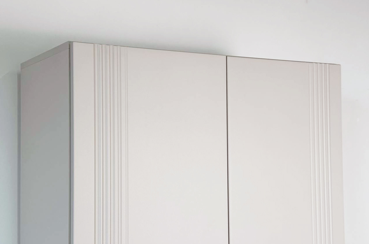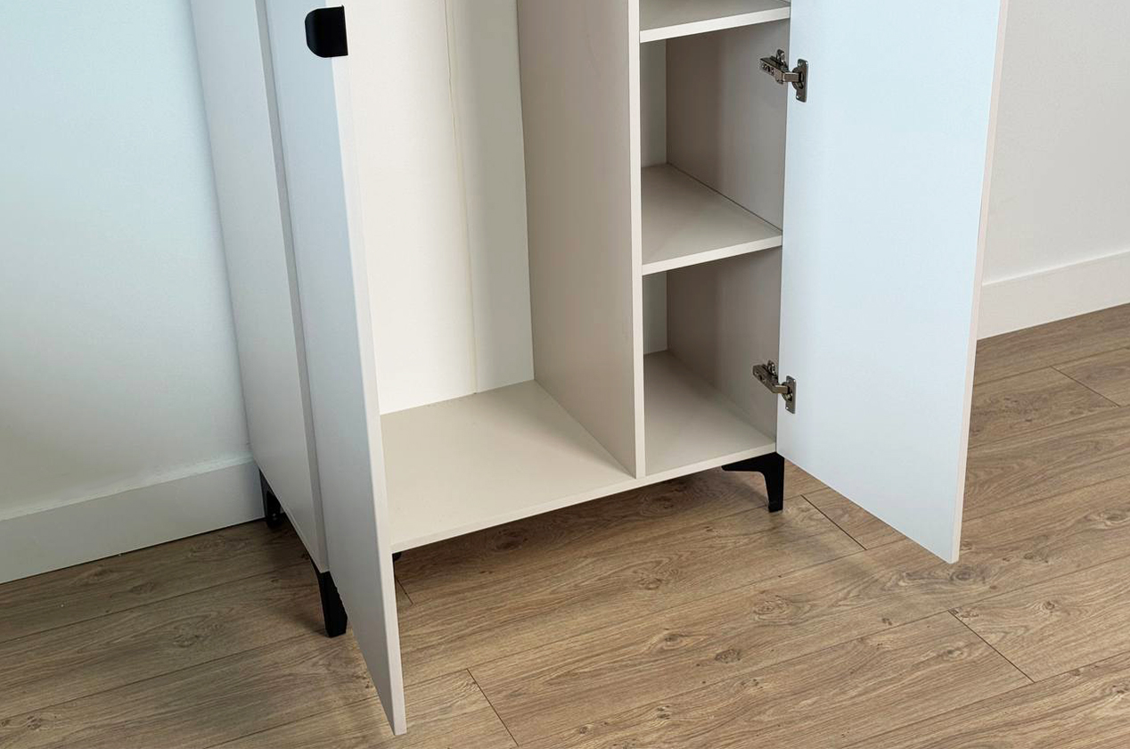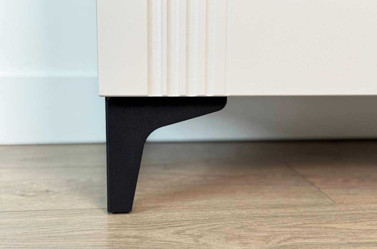 • Стиль и долговечность: Корпус из прочного ЛДСП и элегантный фасад из МДФ с декоративной фрезеровкой и защитной пленкой ПВХ.