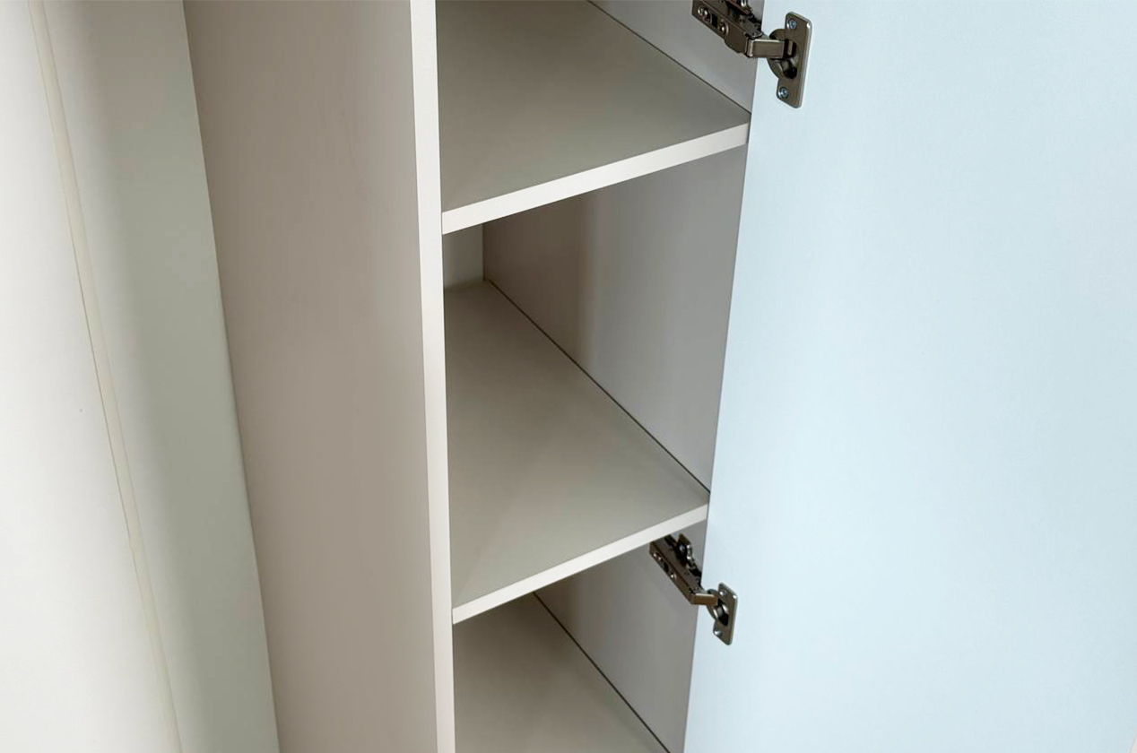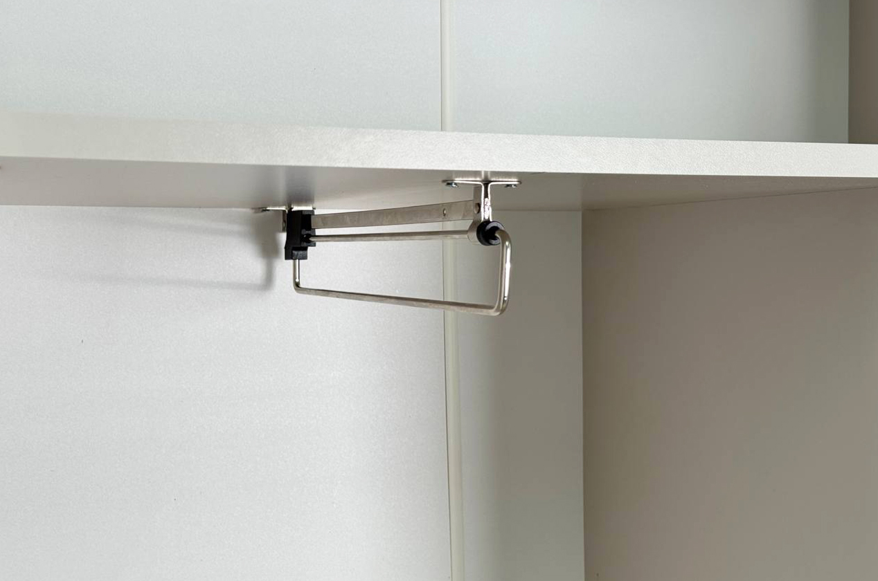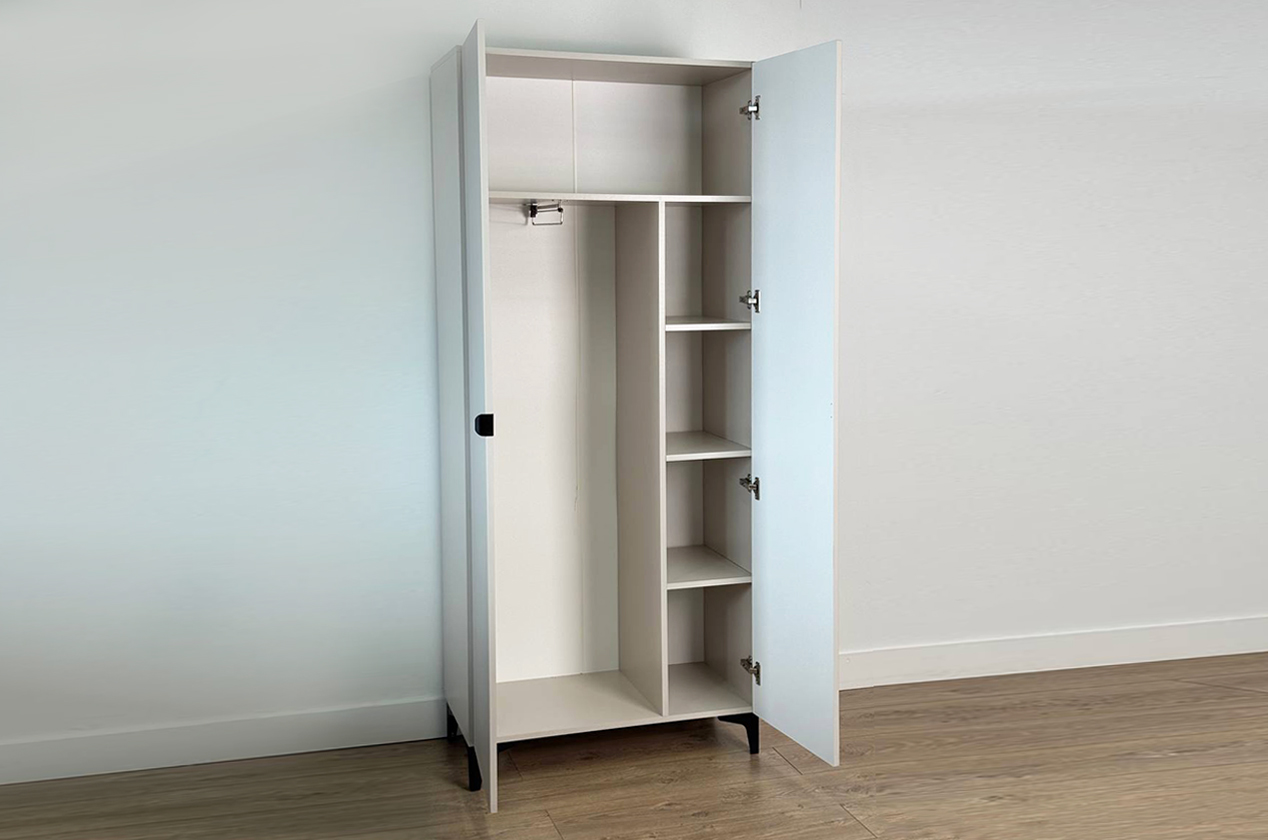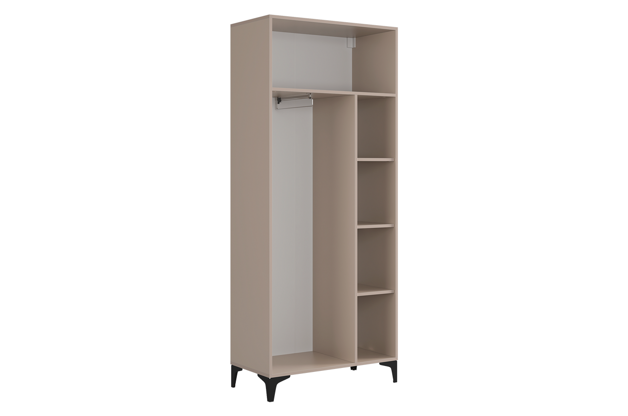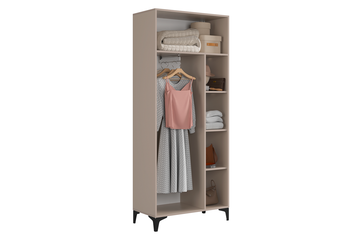 • Умная организация: Продуманное внутреннее пространство с полками и штангой для вешалок позволяет удобно хранить разные типы вещей.