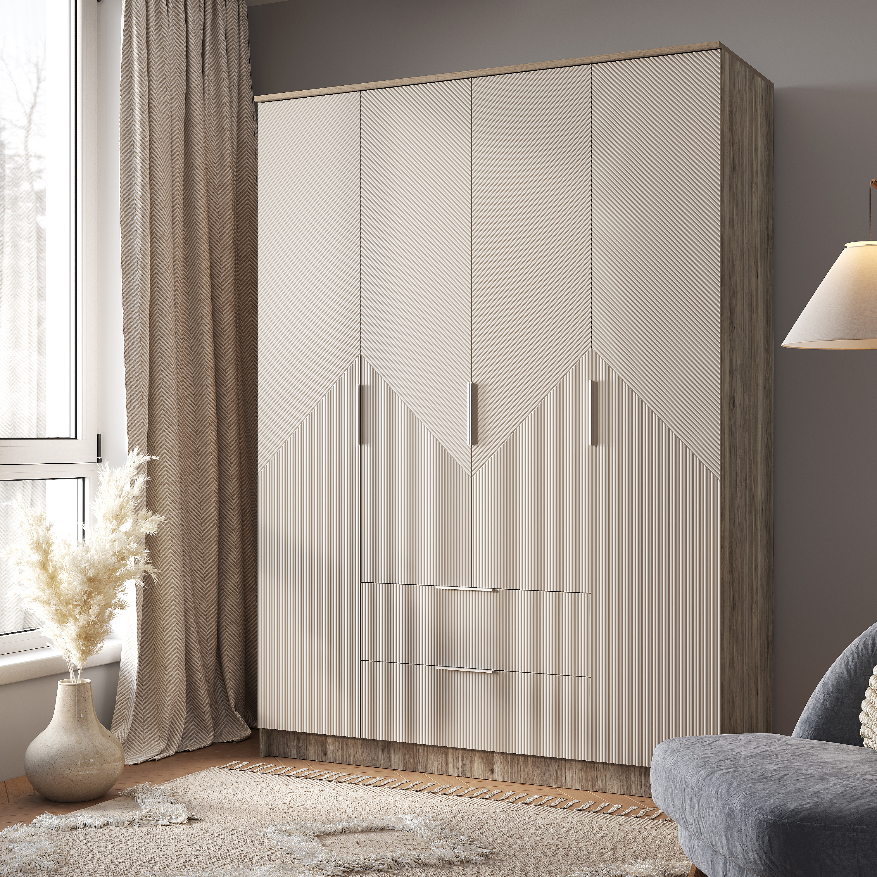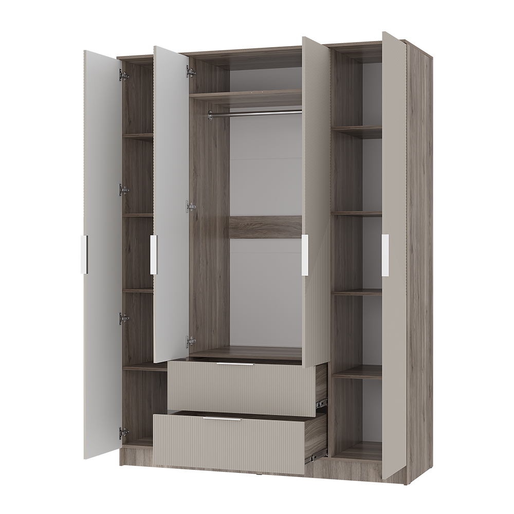 Четырехстворчатый шкаф «Эмилия» ШК-11 воплощает лучшие тенденции современного мебельного дизайна. Нежная цветовая гамма «дуб смоки» и «айриш» в сочетании со стильной фрезеровкой фасадов наполняет пространство светом и воздухом. Модель продумана до мелочей: боковые полки для аккуратного хранения, центральные секции для повседневной одежды на плечиках и два вместительных нижних ящика для обуви или постельного белья.